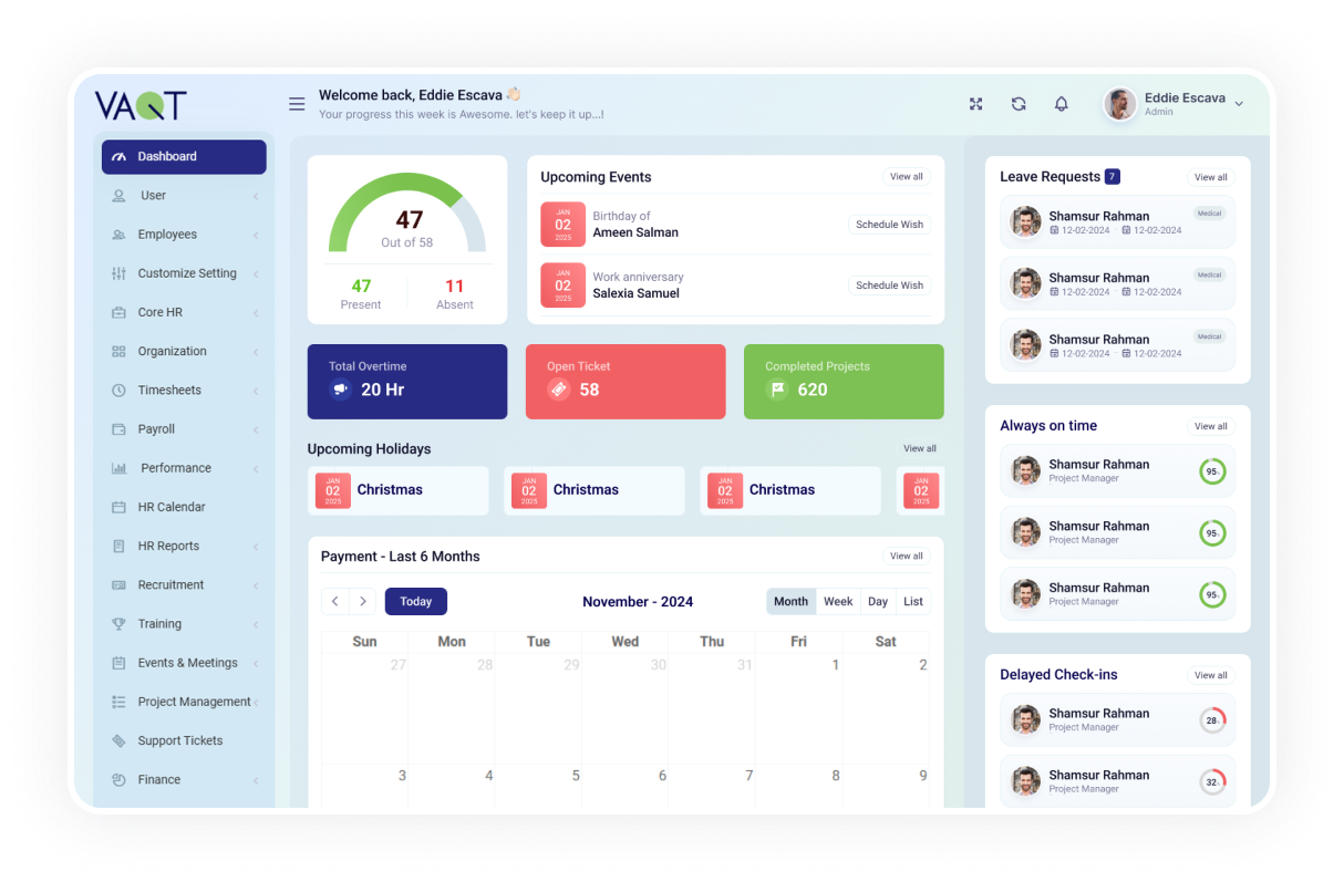 VAQT HRM is a next-generation platform designed to simplify and enhance every aspect of workforce management. With features like attendance tracking, payroll processing, and document management, VAQT ensures efficiency and accuracy. Whether you're managing in-office staff or a remote workforce, VAQT is tailored to meet your needs
